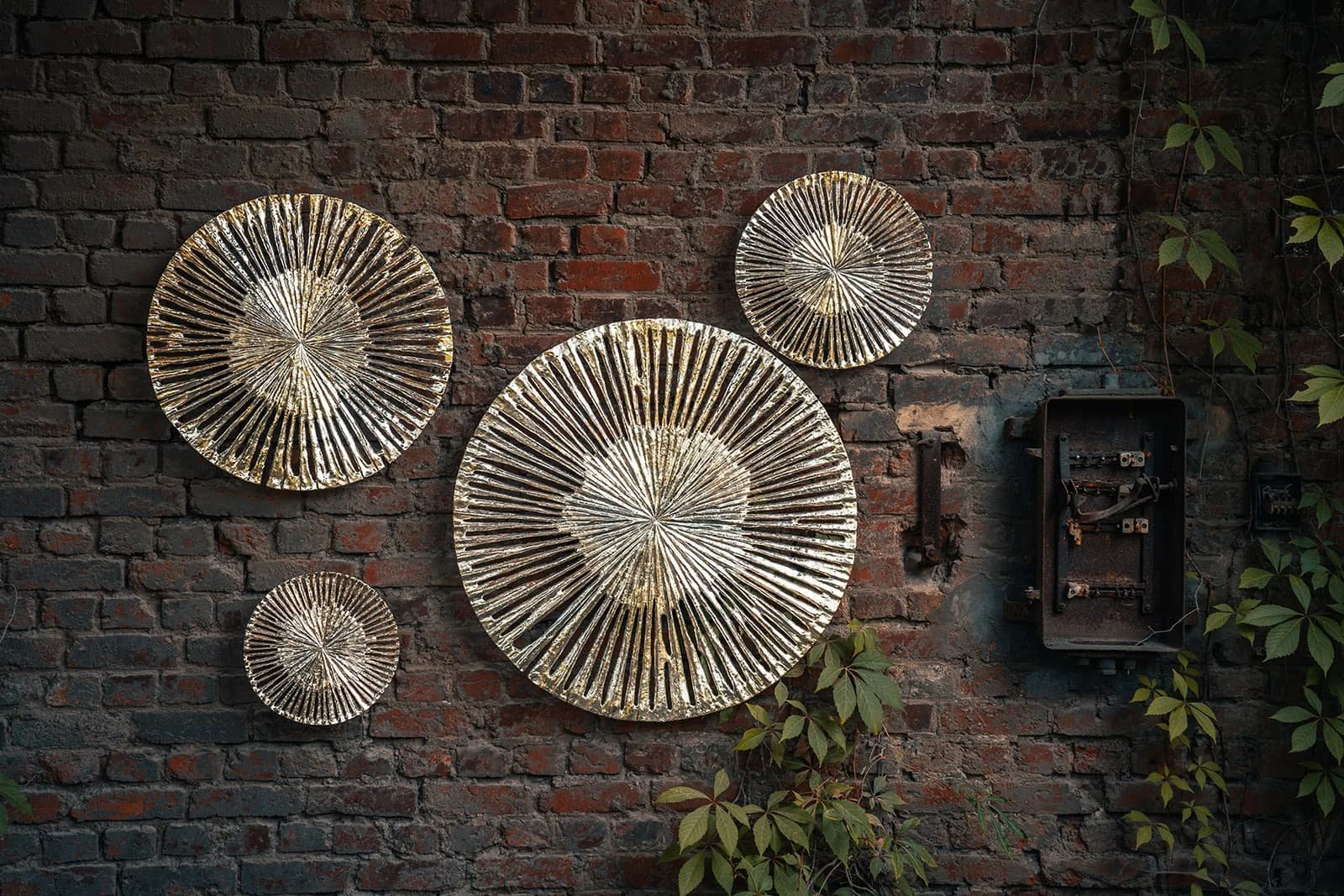 Vier metalen decoratieve schijven met een gespikkeld patroon hangen aan een bakstenen muur, met groene bladeren in de rechter en onderkant van de afbeelding.