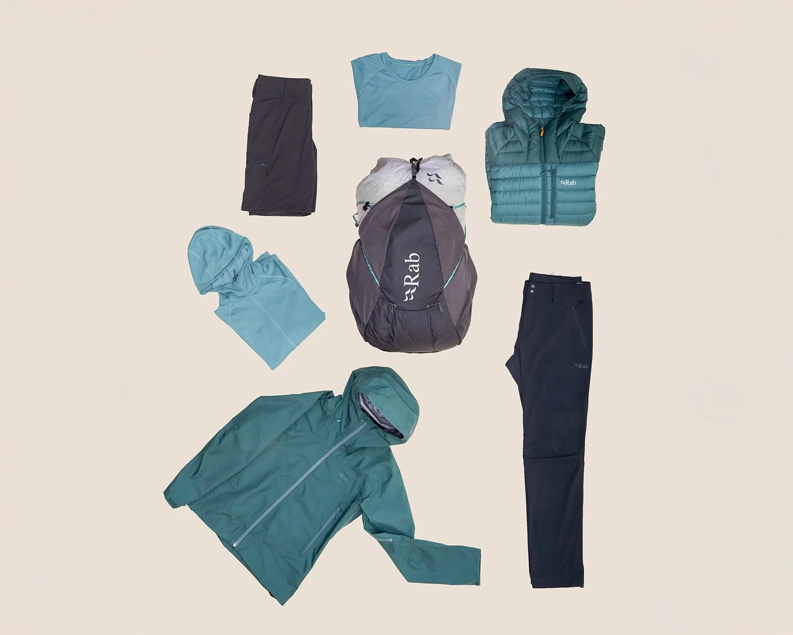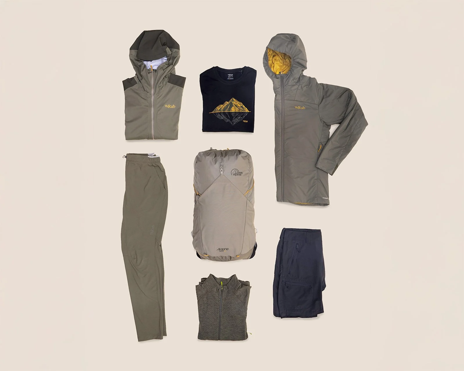 Outdoor kleding en uitrusting, inclusief jassen, broek, rugzak, T-shirt, en een fleece trui