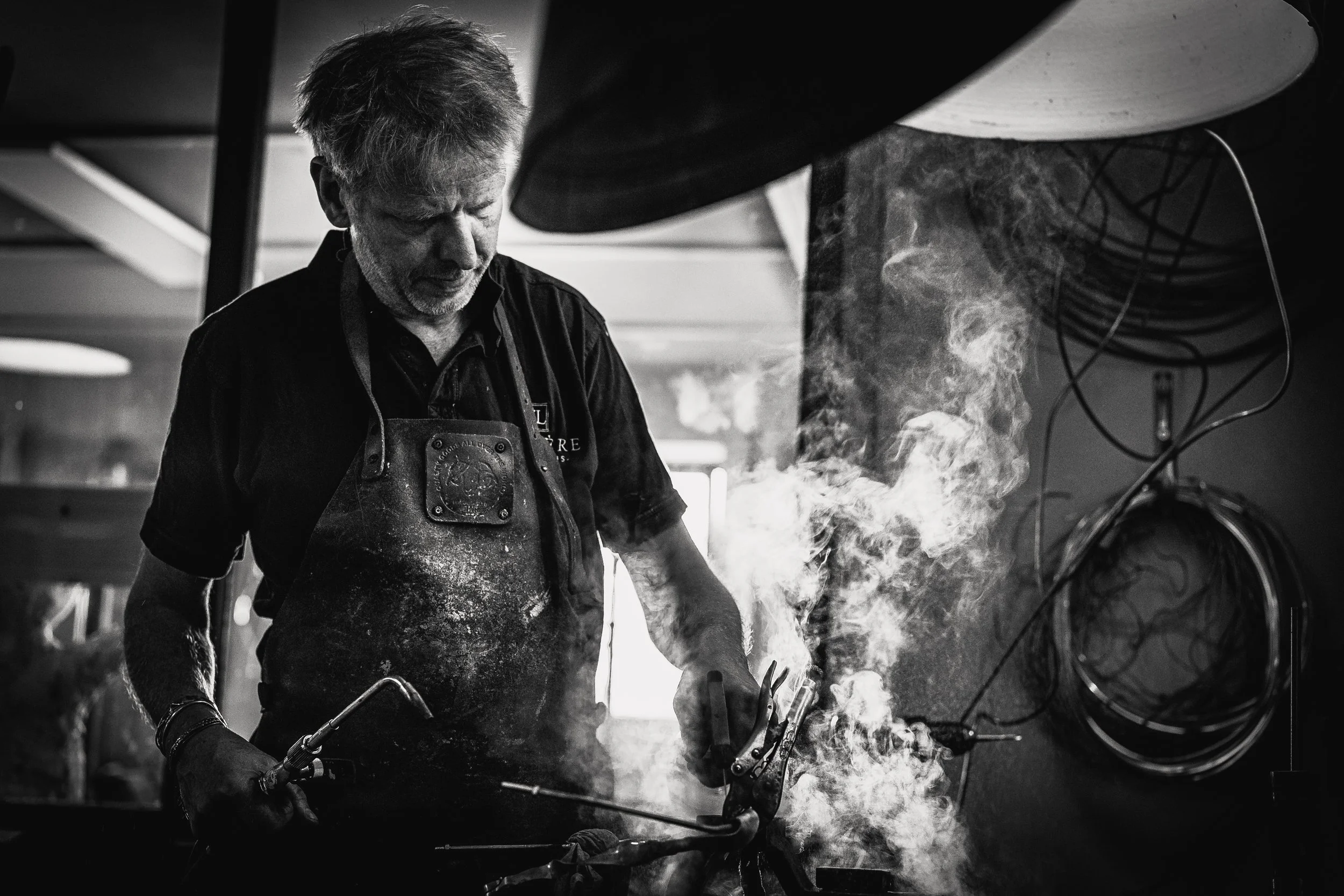 Mannelijke smid die met een tangen een stuk ijzer vasthoudt boven een vlam in een smederij, met rook en damp op de achtergrond.