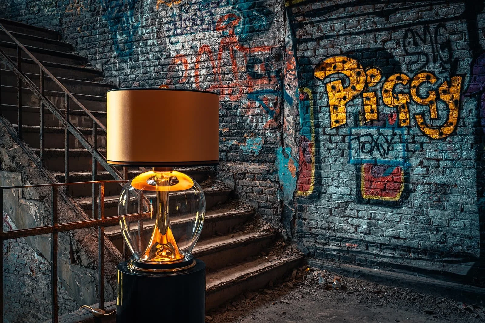Een modern tafellamp met een glazen basis en een beige kap staat voor een graffiti-geschilderde stenen muur, naast een metalen wenteltrap in een industriële setting.