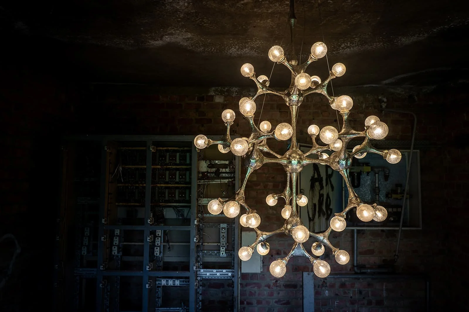 Een hangende chandelier met meerdere gloeilampen hangt in een donkere kamer met een muur van bakstenen op de achtergrond.