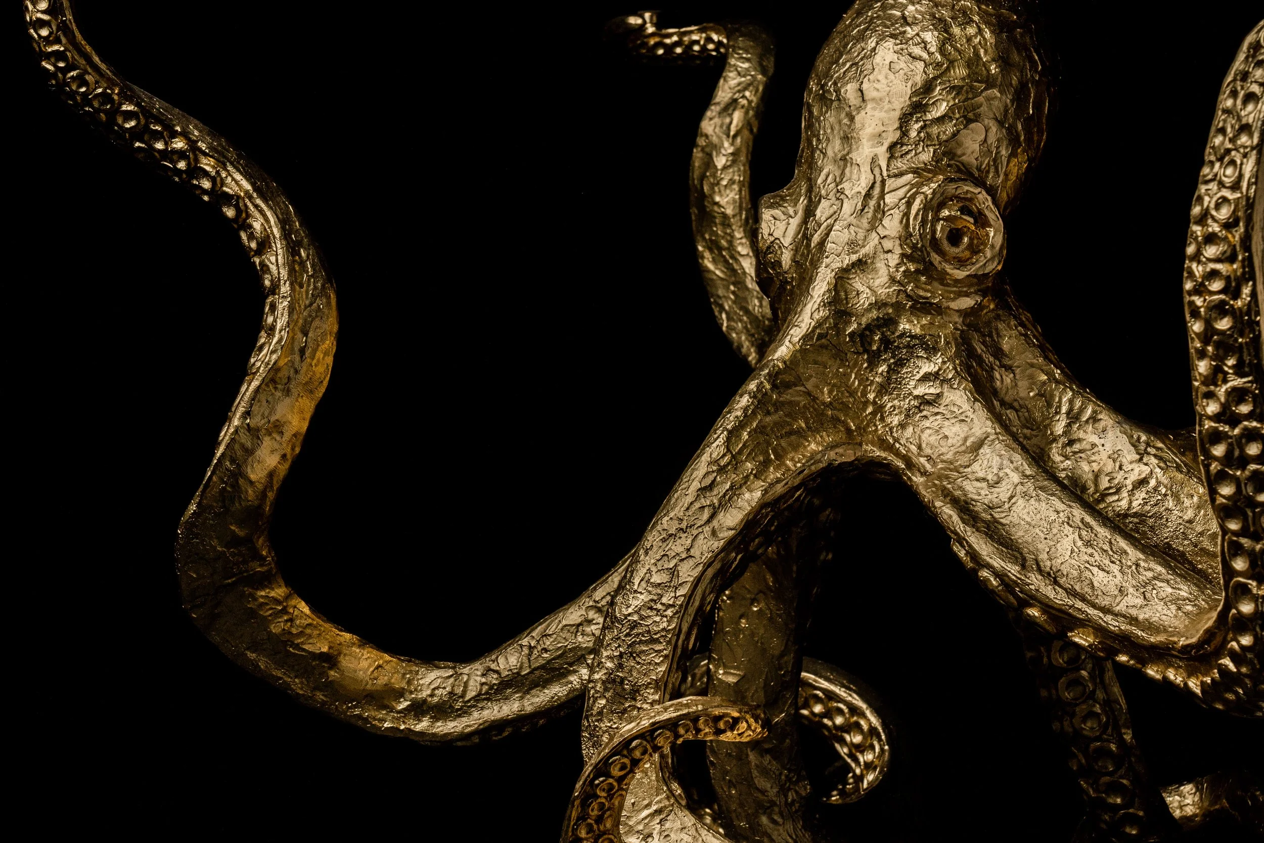 Gouden octopusbeeld met gedetailleerde tentakels en hoofd op een zwarte achtergrond.