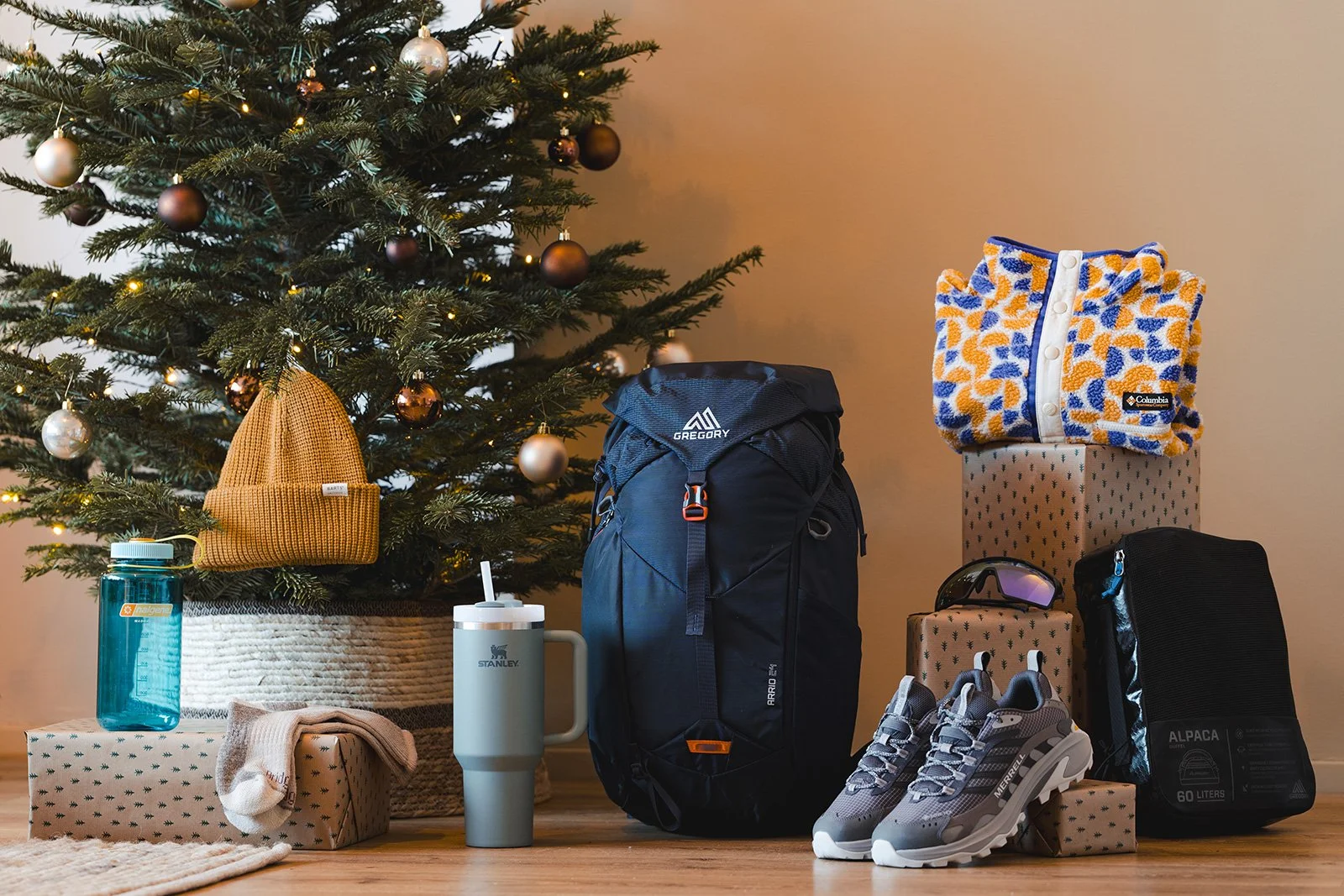 Een kerstboom versierd met gouden en koperen ornamenten, omgeven door diverse kampeer- en wandeluitrusting zoals een blauwe rugzak, wandelschoenen, een waterfles, en inpakken, met cadeauverpakkingen en een gekleurde fleece jas op de achtergrond.