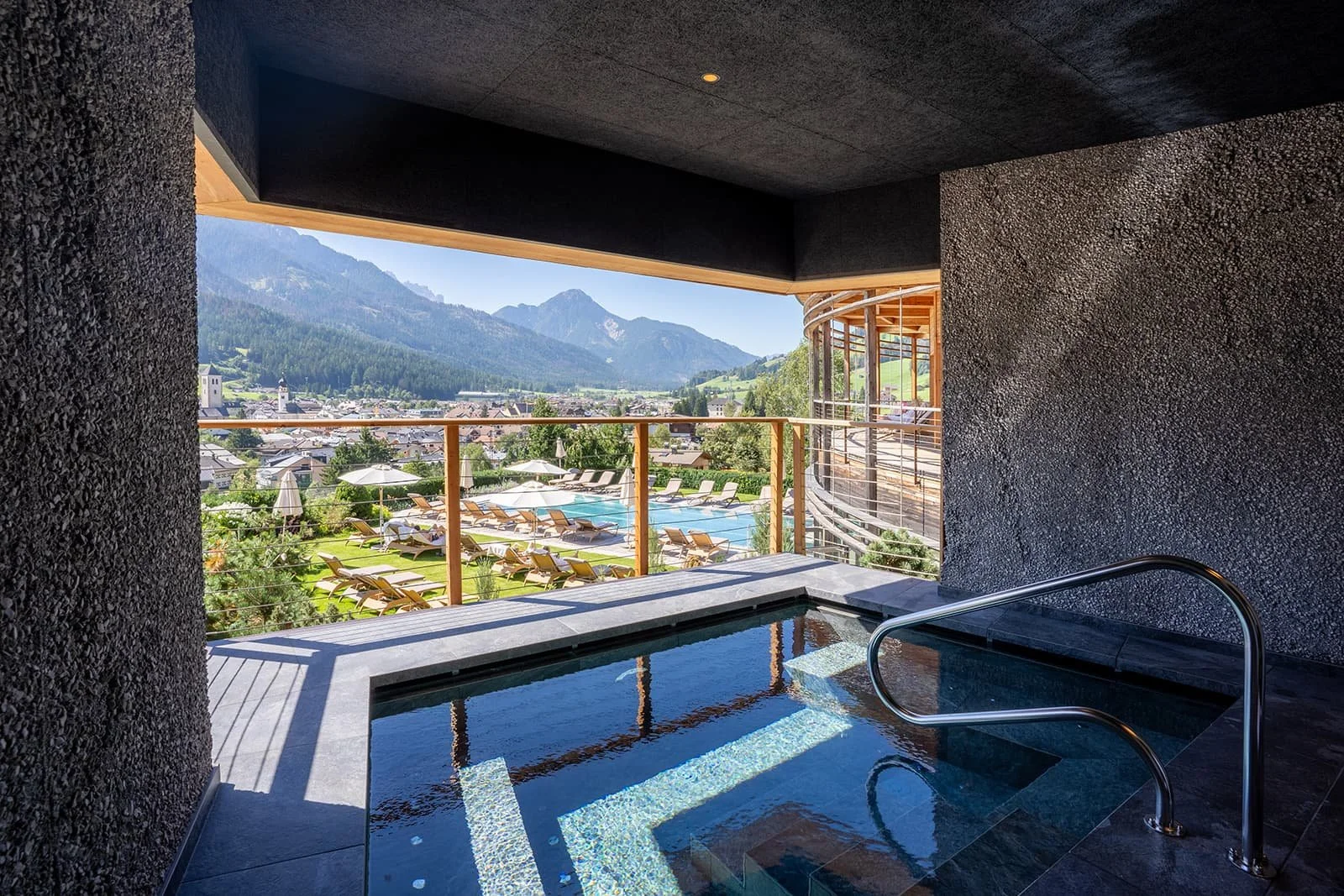 Binnenruimte van een hotel met een jacuzzi, uitzicht op een zwembad, ligstoelen en een heuvelachtig landschap met bergen.